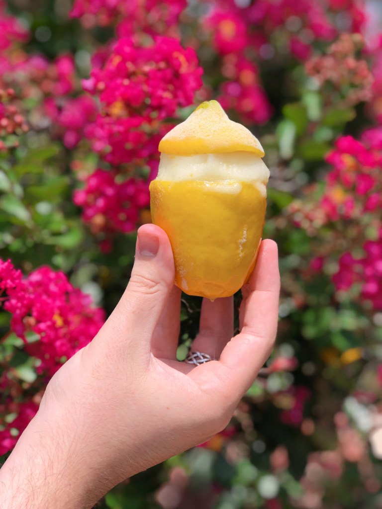 While cooling, juice and zest your lemons. If you want to use the lemons as serving containers, you’ll want to cut the lemons in half and juice out the insides using a citrus juicer. If you don’t have one on hand, use whatever tool you have! Serving in lemons is not a requirement – but is very cute.