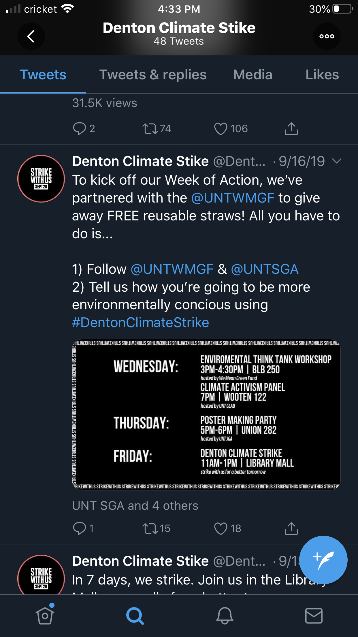 The graphics were used for Twitter posts, Instagram posts, Facebook event covers, and Facebook posts to promote the Denton Climate Strike.