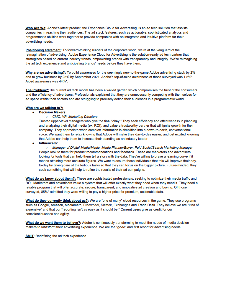 Selected as a member of the strategy team for UNT’s 2020 AAF Student Advertising Competition. The project was a business-to-business campaign for the Adobe Advertising Experience Cloud where I worked on primary research, survey development, target audience breakdown, social media analysis, and creating the creative brief.