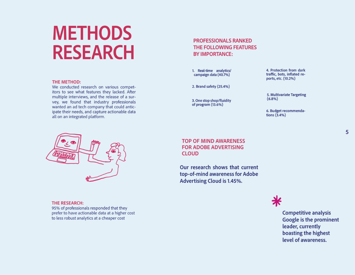 We began our strategy with an industry survey that provided insight to the ad tech landscape, Adobe’s awareness metrics, and key benefits our target audience desires.