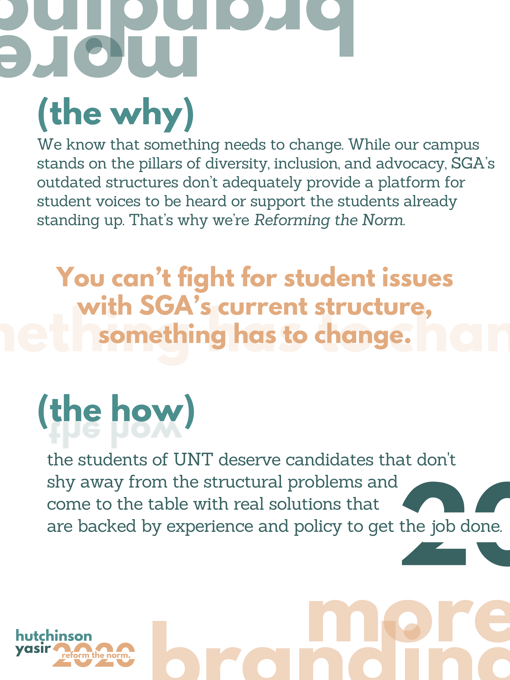 Reforming the Norm is a bold idea. An idea that calls for our community to come together, to stand as one, to advocate for our voices. An idea that wasn’t going to be accomplished in one year or under one administration. An idea that represented the hope and resiliency of the UNT student body. And our brand aimed to represent all of those things.