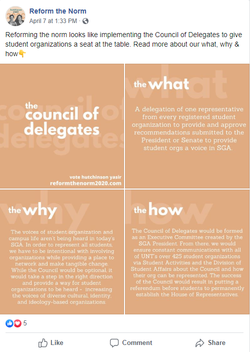 In the Spring of 2020, I ran for Student Body President at the University of North Texas. I knew something had to change, so I ran – I ran to reform the norm. While our campaign lost by only 300 votes, the issues sparked conversations and the solutions we proposed layed the ground work for tangible change.