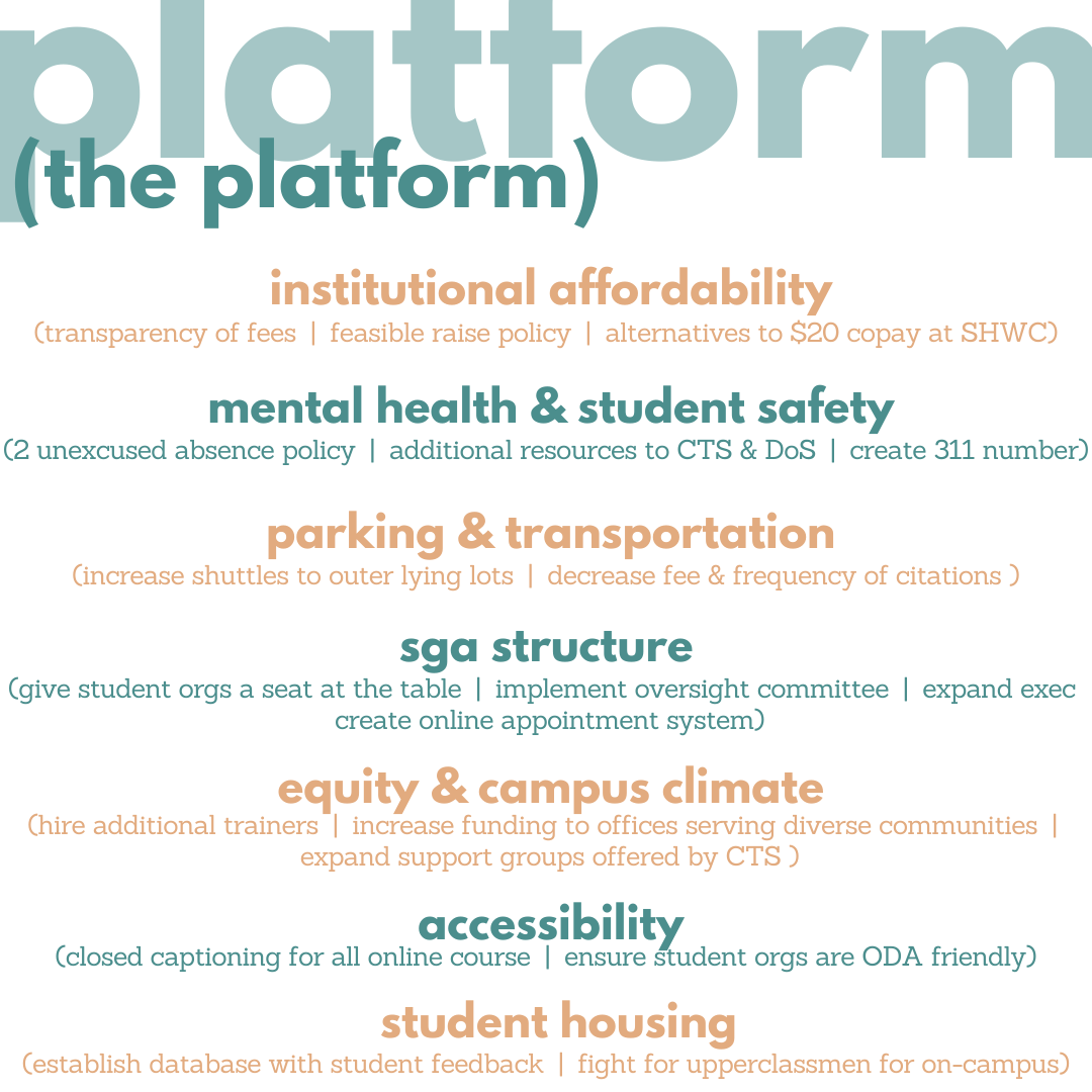Our campaign stood on the idea that student government should advocate for real solutions for the real problems our student body faces. The platform was bold and backed by the experience that could get the job done. But most of all, it layed the groundwork for the work that is yet to be done.