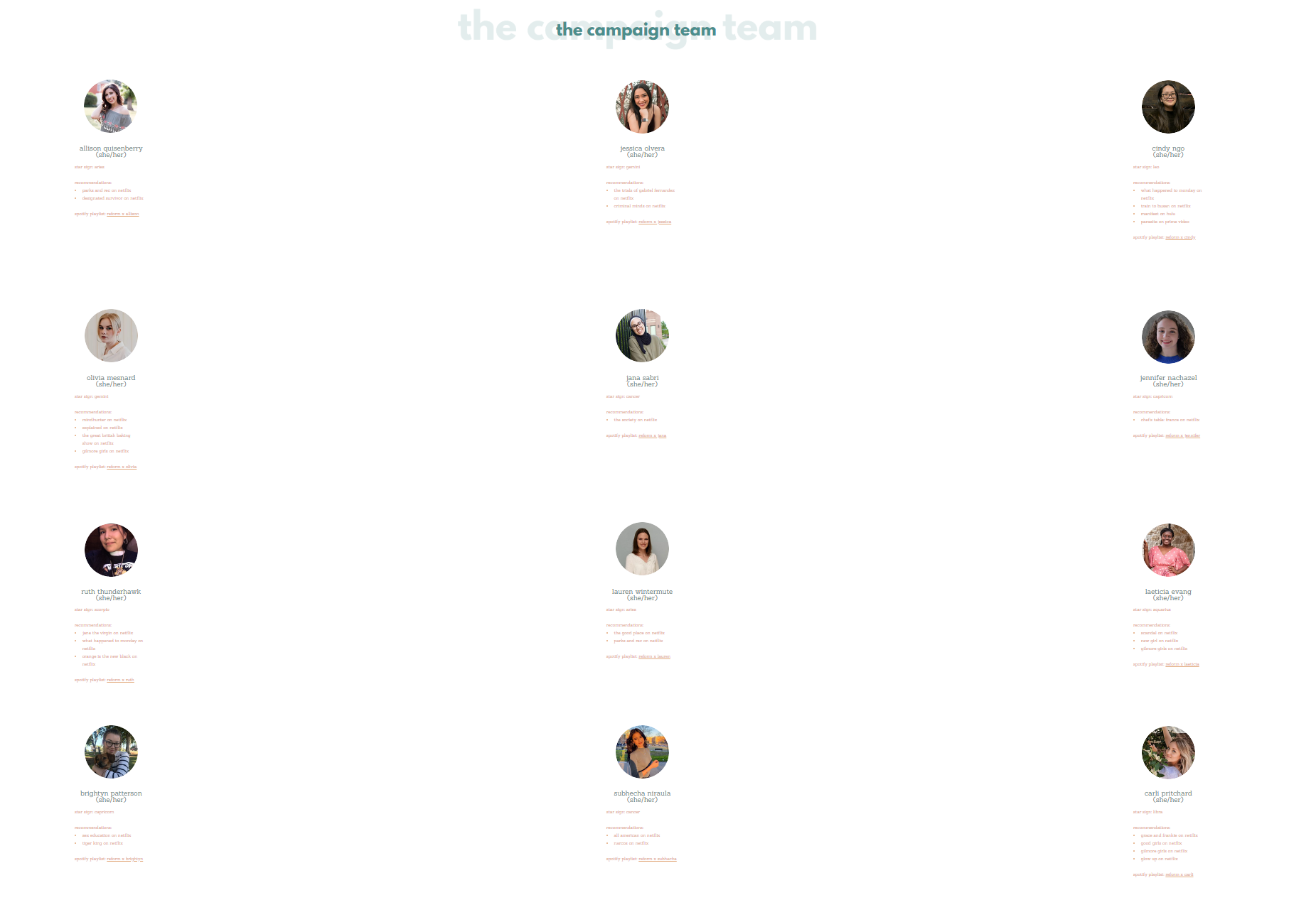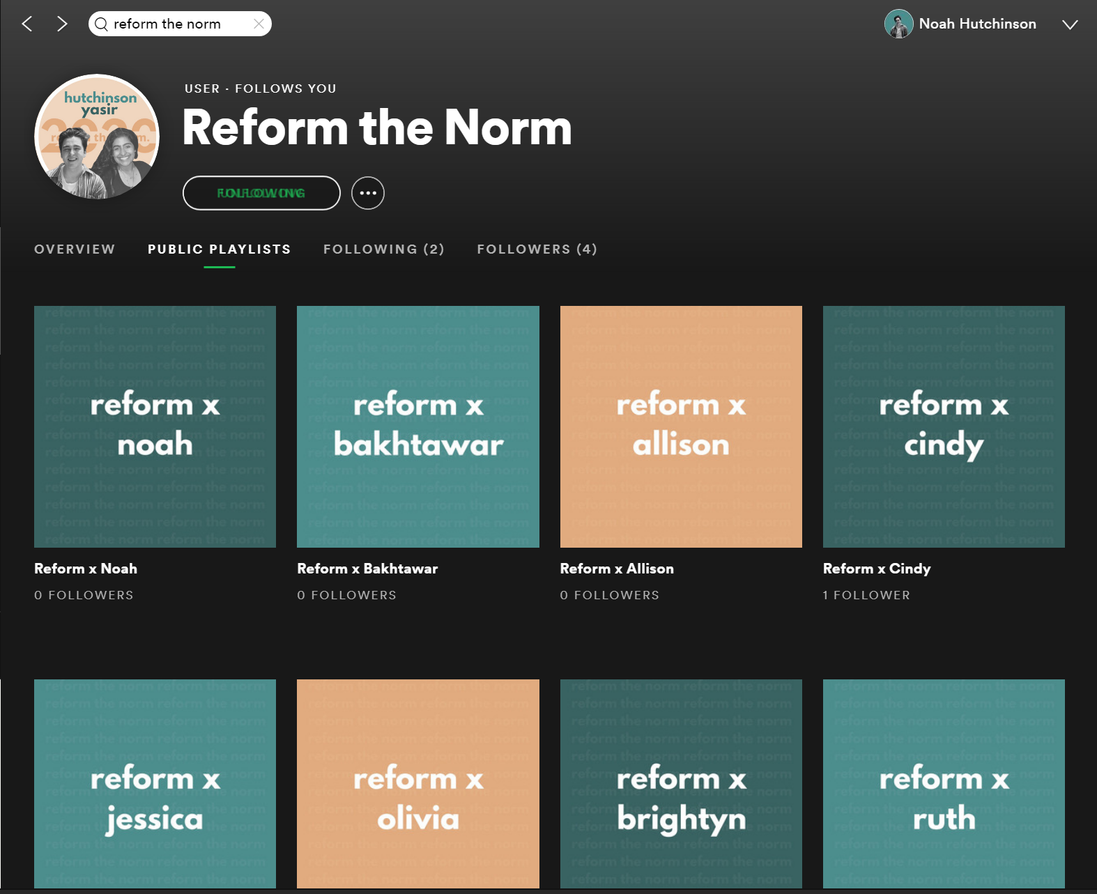 We wanted to bring the human side to our campaign through showing off our favorite music. Each campaign team member created a Spotify playlist titled “Reform x …” which we shared on our Instagram stories and website bios.