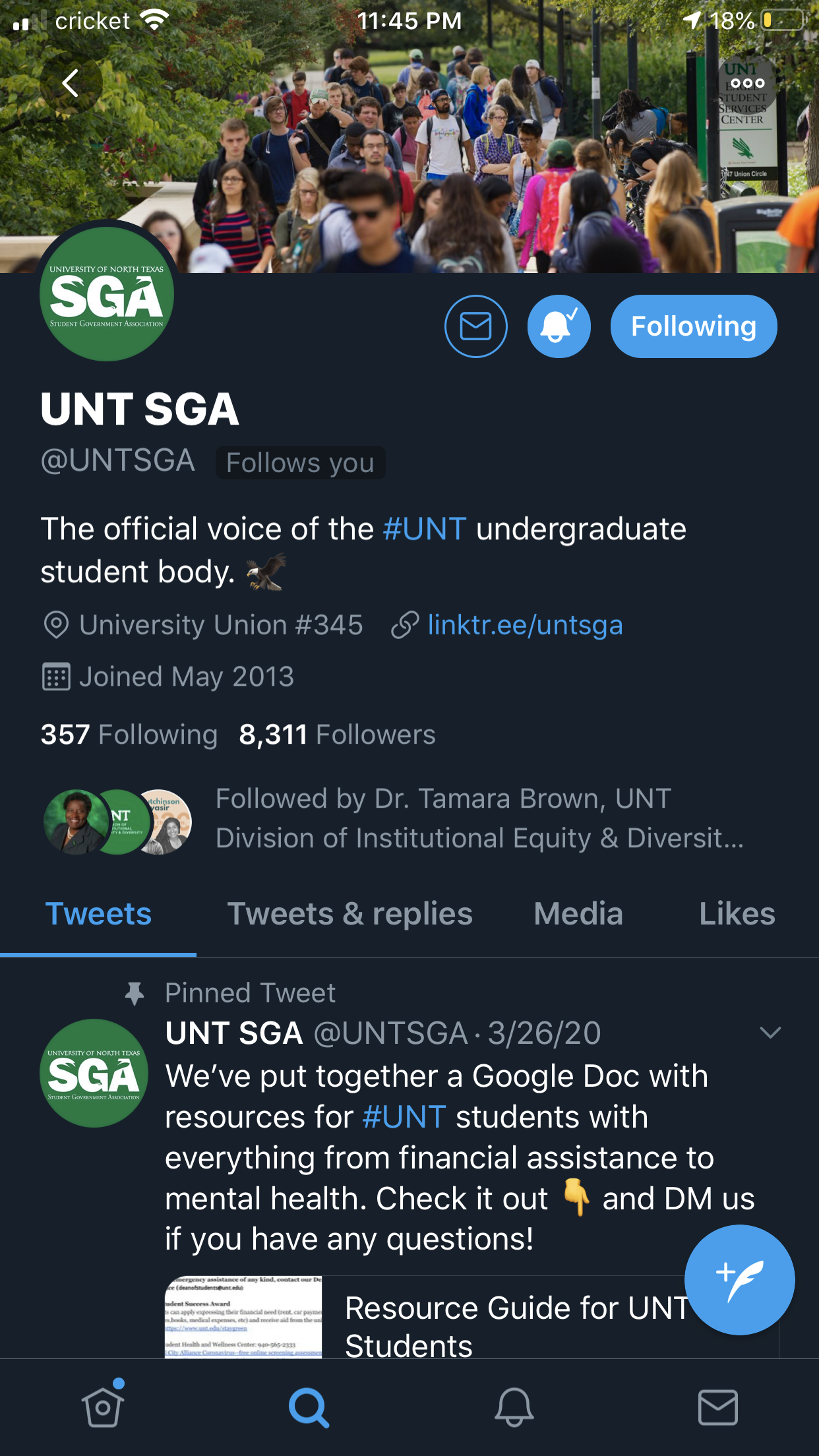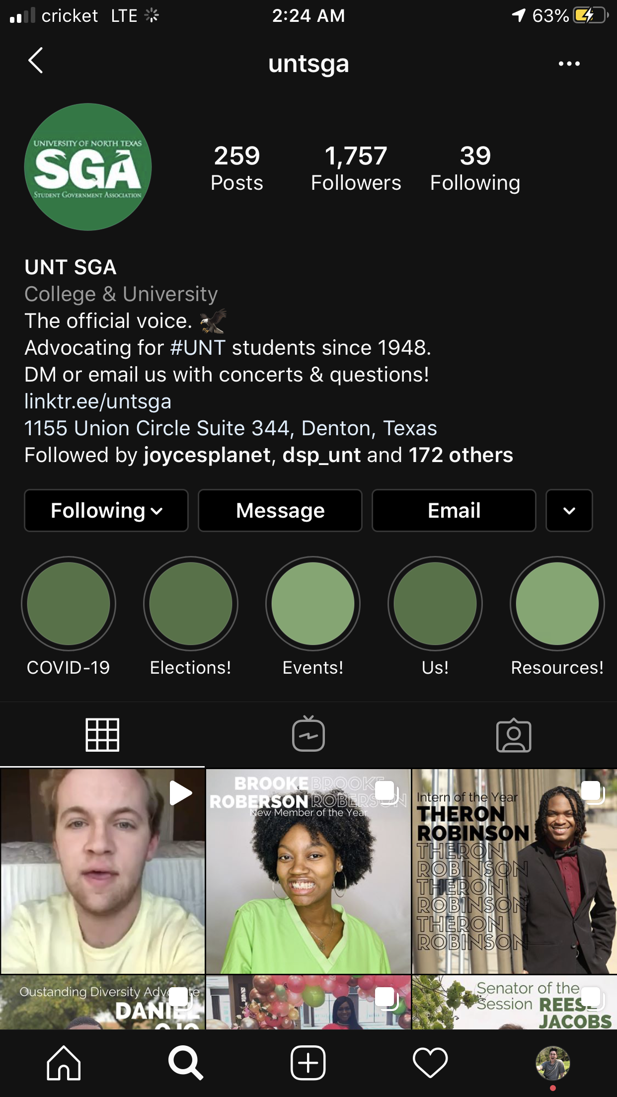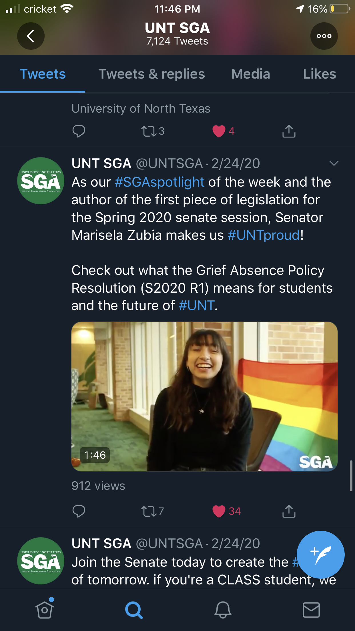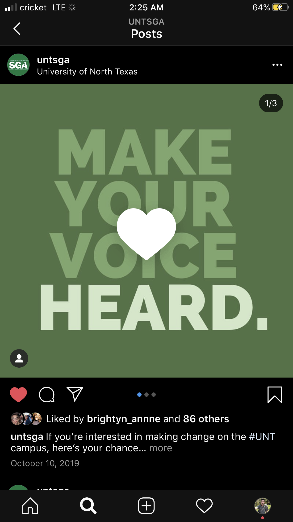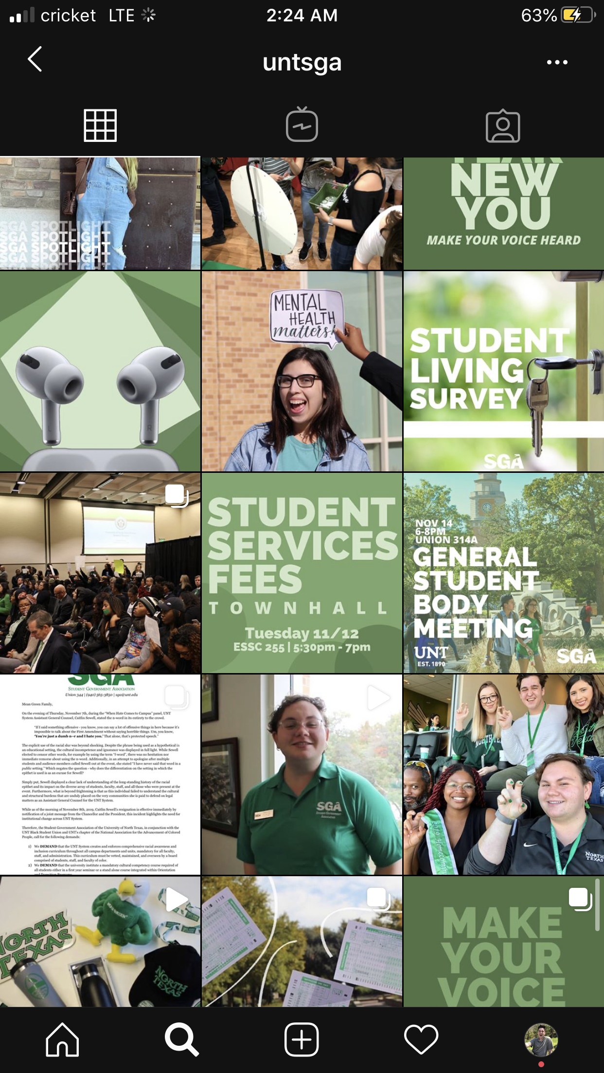 For the 2019-2020 academic year, I served as the Communications Director for the University of North Texas’ Student Government Association where I helped develop SGA’s branding, increase social media engagement, and supervised the first-ever Communications Team.