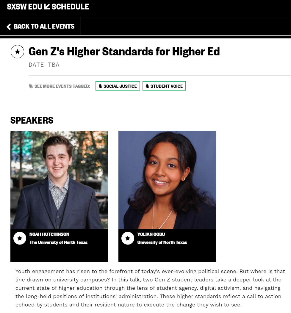 After gaining hands-on experience of student activism, we decided to share our experience. Among a competitive field, Yolian and I were selected to speak at the South by Southwest EDU 2020 Conference to talk about all things Generation Z and the role of civic engagement on college campuses. Despite the conference being cancelled in light of the global COVID-19 pandemic, we were honored to be selected.